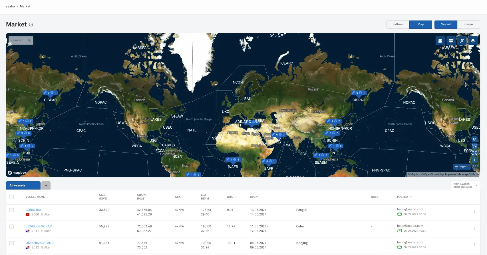 Explore the Circular Inbox, your hub of commercial intelligence, structured as a digital version of your chartering inbox. All cargo and vessel circulars you receive in your chartering email inbox are displayed here, fully actionable. Utilise intelligent filters to find specific vessels and requirements instantly, and create various set filters, or “submarkets,” for an immediate overview of needed market segments. Visualise open vessels and available cargoes on a map to quickly assess the current supply and demand balance in your market.