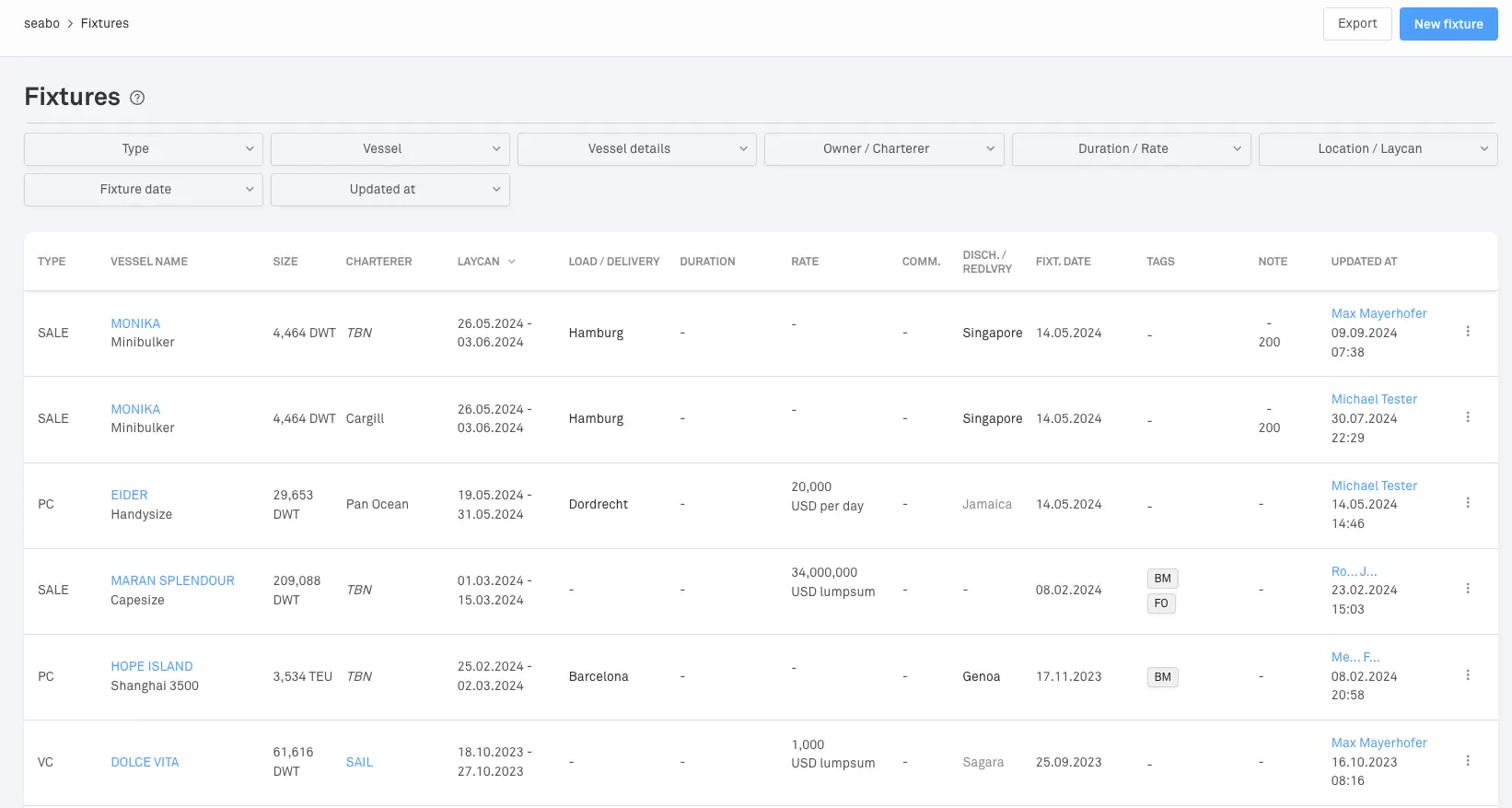 Optimise your workflow with seabo’s “Fixtures” feature, enabling you to record fixtures and gather market information collaboratively with your team. Utilise filters, add comments and tags, and easily extract reports at any time. This functionality ensures all relevant data is organised and accessible, streamlining your operations and enhancing decision-making processes.
