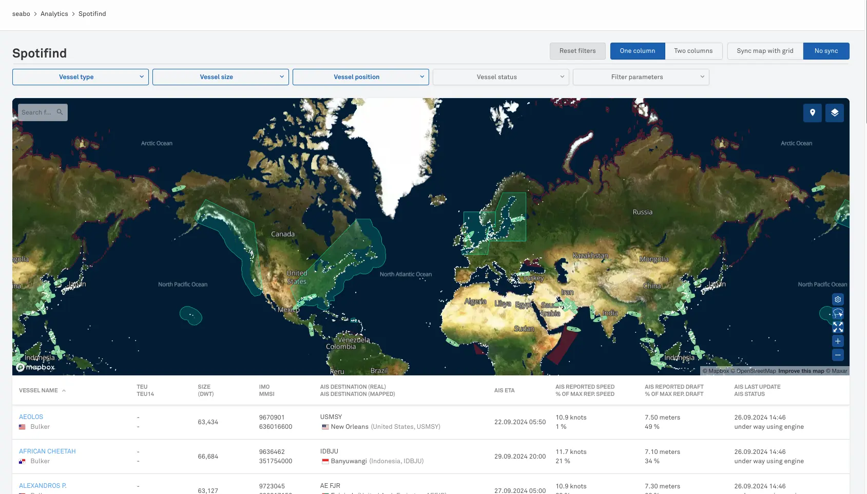 Streamline your search for spot vessels available for orders with Spotifind. Identify potential spot vessels by filtering based on size and type, allowing you to quickly spot competitors vying for the same deal. Beyond identifying vessels, Spotifind doubles as an effective monitoring tool. Refine your search with filters for speed or draft numbers, giving you a clearer view of market dynamics and the movement of specific vessel types. Wondering to where Panamax vessels are currently ballasting? Spotifind provides these insights at your fingertips.