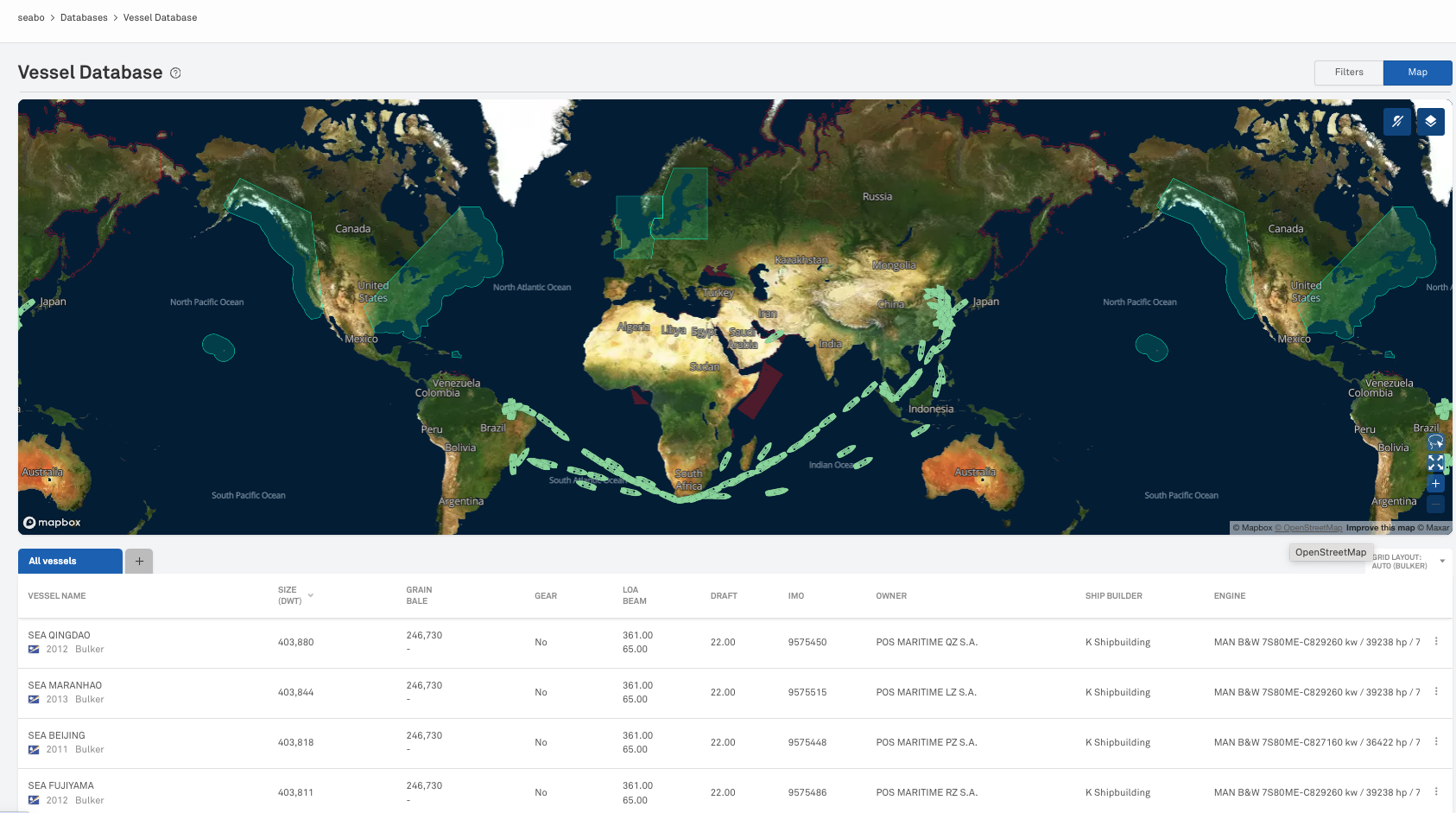 Access the Vessel Database, a comprehensive technical database of the global commercial fleet of bulkers, MPPs, and container ships, entirely at your disposal. The constantly updated database allows you to filter ships to meet your specific needs. Collect all necessary information and select individual vessels to incorporate into your fleet for easy and seamless fleet list and database management.