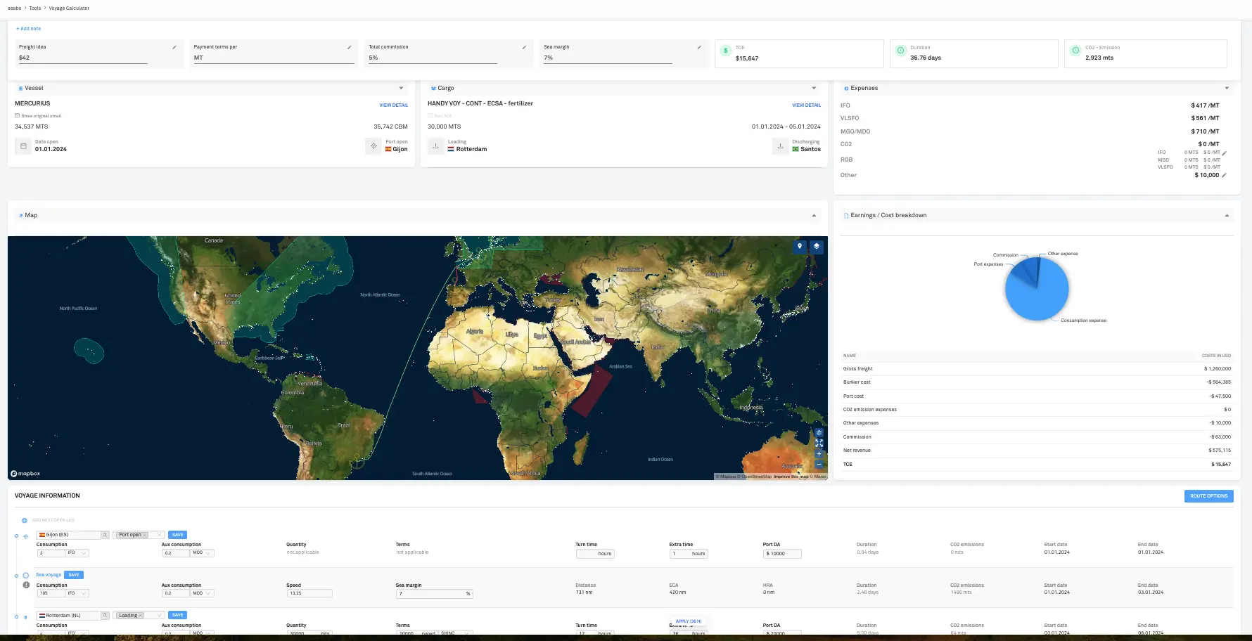 Utilise seabo’s lightning-fast voyage calculator that incorporates data from various external sources. Since the system already understands vessel and cargo details and the sailing route, required manual user input is minimised. Combined with constantly updated bunker prices and port expenses, this enables almost fully automated TCE calculations. Additionally, seabo automatically calculates the TCEs of surrounding vessels so you can always check competitiveness.